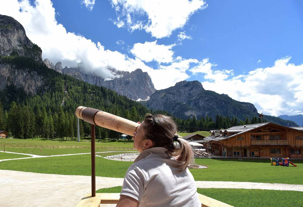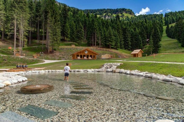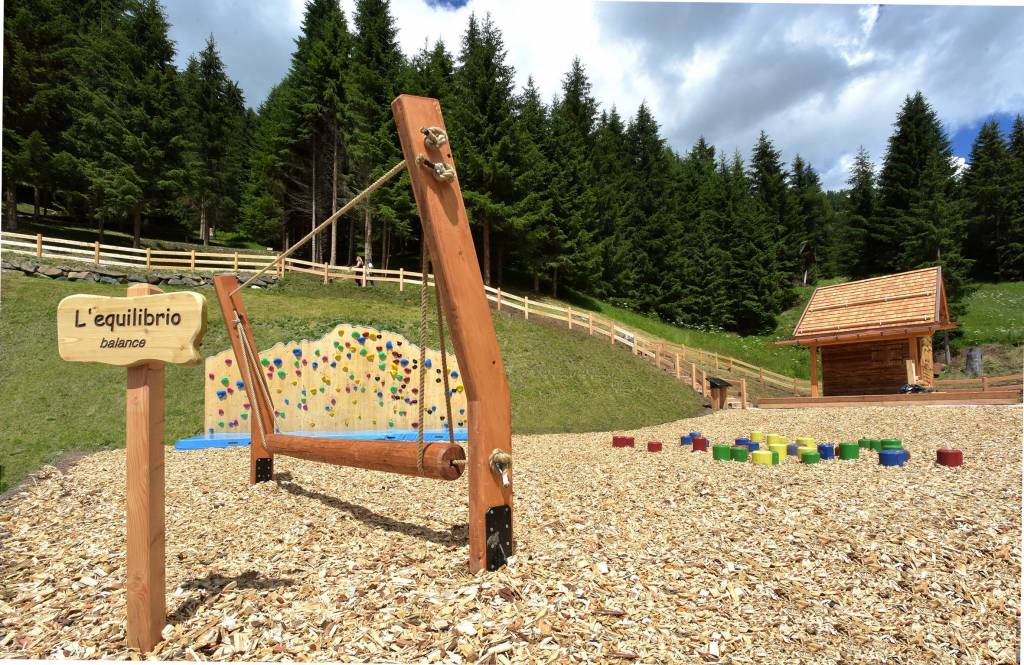 Forme semplici, materiali locali e lavorazioni ecocompatibili hanno dato vita ad un vero e proprio angolo di “natura aumentata” a misura di famiglia, che coinvolge tutti i sensi riempiendo il cuore di mille emozioni. Spazi di attività e gioco si alternano ad angoli relax, con una zona barefooting che unisce l’aspetto avventuroso del camminare a piedi nudi sull’acqua ad una profonda sensazione di benessere. Il gioco diventa parte essenziale dell’esplorazione, portando a conoscere le forme del bosco, le proprietà di erbe e funghi, l’equilibrio da ricercare sui dislivelli in montagna. Un chiaro invito a toccare, assaggiare, annusare, capire le forme, i colori e i movimenti.