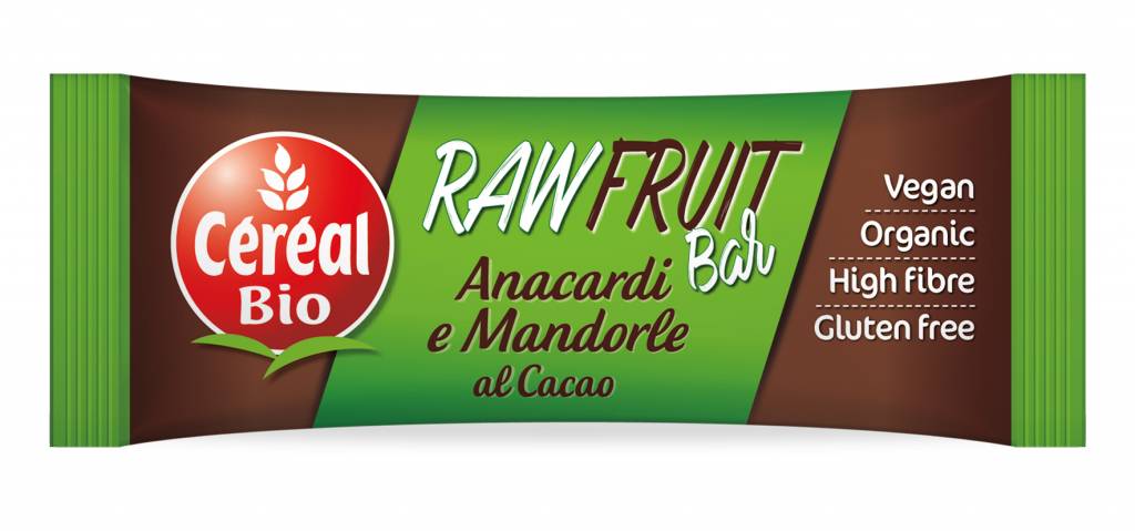 RawFruit Bar Anacardi e Mandorle – Datteri* 55%, uva Thompson* 10%, riso soffiato*, anacardi* 9%, cacao in polvere crudi* 6%, mandorle* 5%, burro di cacao crudo*.