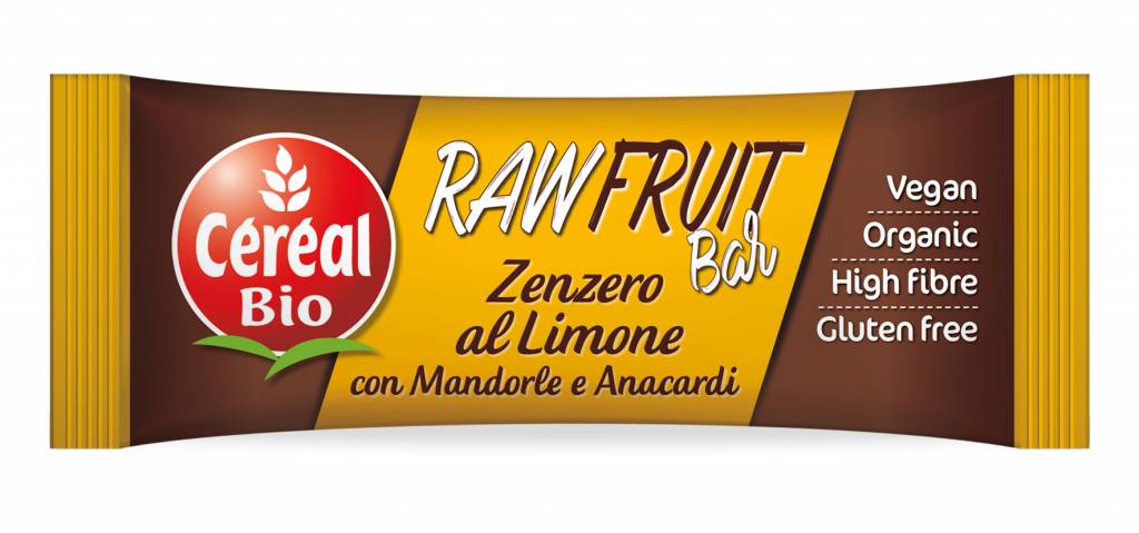 RawFruit Bar Zenzero – Datteri*55%, uva Thompson* 12%, riso soffiato*, anacardi* 6%, mandorle* 6%, proteine di semi di canapa* 5%, burro di cacao crudo*, zenzero* 0,7%, essenza di limone* 0,3%.