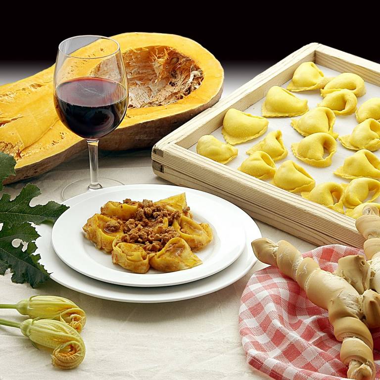 come la Coppia ferrarese IGP (pane dalle forme ritorte) e il Cocomero serviti alla corte degli Estensi, fino alle pere e le pesche IGP. E poi salumi, tartufi e dolci imbandiscono piatti e tavole tra i colori autunnali.