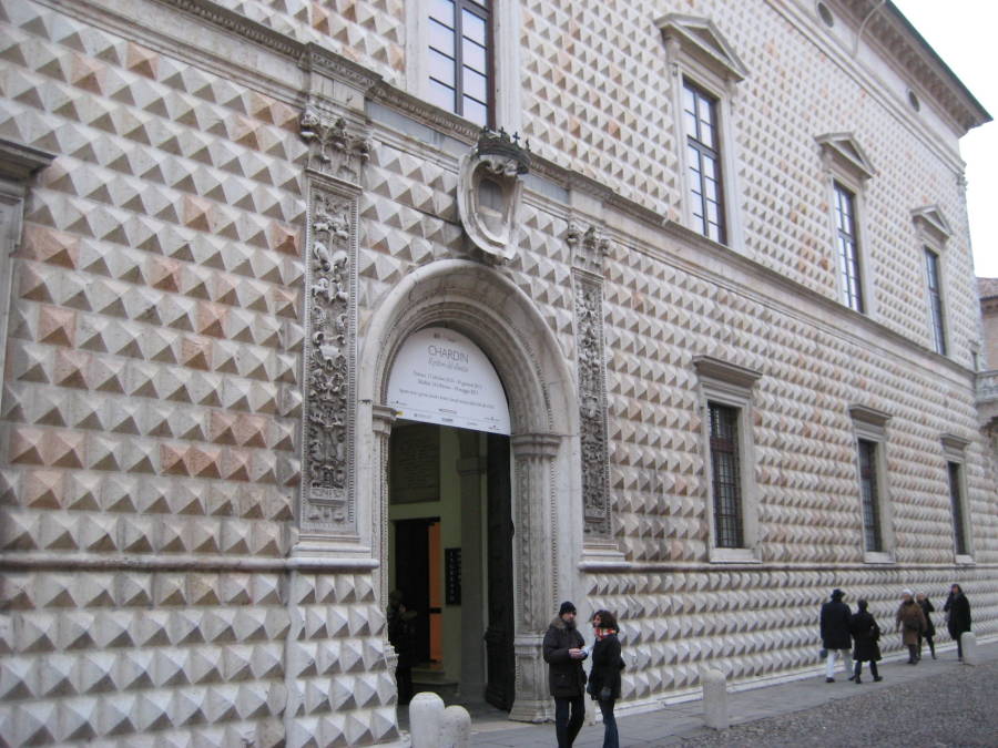 Il Palazzo dei Diamanti è un caratteristico edificio progettato nel 1493 da Biagio Rossetti per creare insolite prospettive ed effetti di luce. Si chiama così per via degli 8.500 blocchi a forma di piramide schiacciata, di marmo bianco striati di rosa, che formano la sua struttura esterna. All’interno è visitabile un cortile rinascimentale con chiostro e pozzo ed al primo piano la Pinacoteca Nazionale di Ferrara che conserva una collezione di opere di eccezionale valore di Cosmè Tura, Andrea Mantegna, Ercole de Roberti e Dosso Dossi. Invece, al pian terreno del palazzo si susseguono da anni straordinarie mostre d’arte.