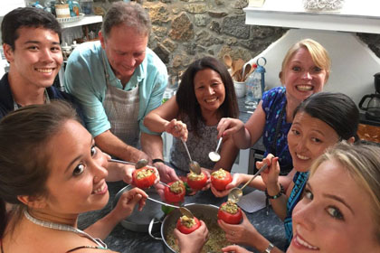 fatti di tsatziki, torta rustica di spinaci, peperoni e pomodori ripieni, manzo con orzo. Teta illustra l’intera procedura e guida gli ospiti nella preparazione, per poi gustare tutti insieme le prelibatezze cucinate. E nell’attesa della chiamata a tavola i cuochi possono ritemprarsi dalle fatiche dei fornelli visitando l’azienda agricola e il vigneto di famiglia oppure fare un bagno in una bellissima spiaggia nelle vicinanze. Gli appassionati sommelier non possono perdere il corso di degustazione di vini, della durata di circa 2 ore, in cui si assaporano i più noti vini greci, e alla fine del quale si pranza o cena con piatti di accompagnamento classici.