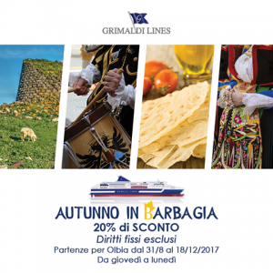 Grimaldi Lines vi porta alla scoperta della Sardegna più autentica e sconosciuta, lontano dai circuiti turistici tradizionali. La Compagnia di Navigazione ha infatti ideato e lanciato la nuova promozione Autunno in Barbagia, in concomitanza con l’omonima manifestazione in programma sull’isola dal 1° settembre al 17 dicembre 2017.  Alla 17^edizione della manifestazione Autunno in Barbagia,organizzata e promossa dalla Camera di Commercio di Nuoro e dall’Azienda Speciale ASPEN, di cui Grimaldi Lines è partner, hanno aderito 32 località dell’entroterra sardo; così, nel corso di ogni week-end, a turno, i paesi apriranno le porte ai visitatori per raccontare la loro storia, la loro cultura e le antiche tradizioni dell’isola, con numerosi appuntamenti dedicati all’artigianato, al folklore ed alle specialità culinarie locali.