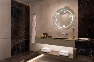 Ospitalità moderna nell’Antica Roma – Lasciandosi alle spalle il trambusto della città e varcando la soglia della hall dell’hotel, gli ospiti sono accolti in un’atmosfera rilassante ed ospitale caratterizzata dalla presenza di un piccolo bar con pavimenti in marmo lucido Sahara Noir e da un ampio sistema di illuminazione circolare che ricorda l’oculo zenitale del Pantheon.