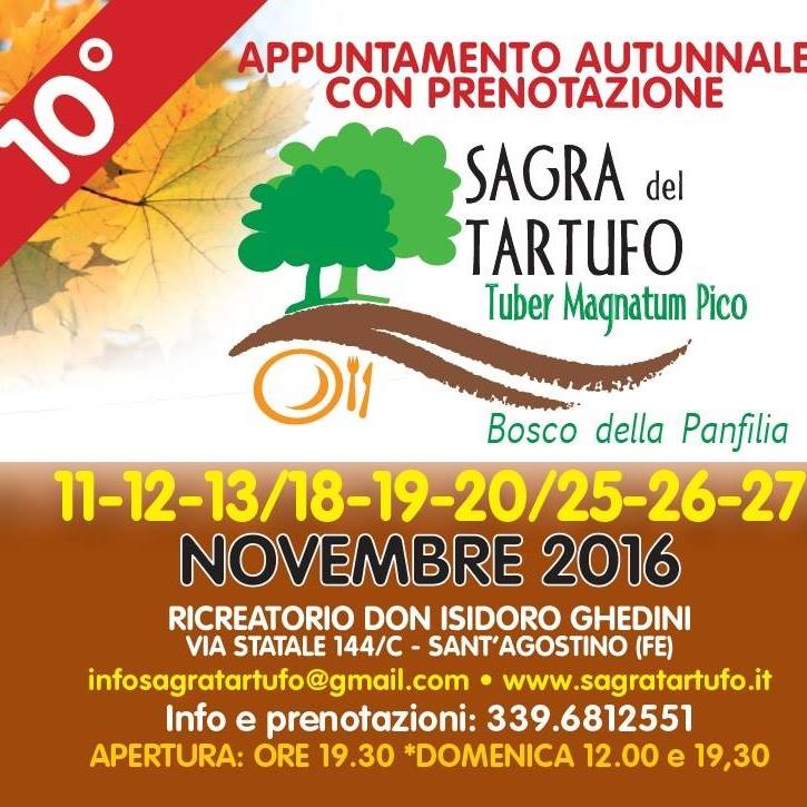 Infatti, Sant’Agostino dall’11 al 27 novembre, per tre fine settimana consecutivi, torna a festeggiare il suo tesoro più prezioso con la 10^edizione della Sagra del Tartufo autunnale; una specialità che cresce abbondante nel bosco della Panfilia, meraviglia naturalistica che si estende per circa 80 ettari,    locandinaa pochi passi dalla “città del tartufo” in provincia di Ferrara.