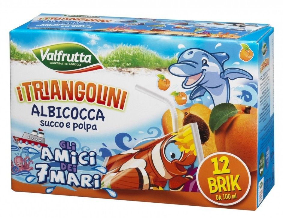 I TRIANGOLINI VALFRUTTA sono la conferma di un impegno costante verso la qualità, il servizio e l’interazione ludica con i bambini. Prodotti esclusivamente con la migliore frutta italiana, non contengono né conservanti, né coloranti, né aromi e sono senza glutine. E si presentano in una confezione rivoluzionaria, dalla forma assolutamente unica, un brik triangolare mai visto prima in cartoncino Tetra Pak, un materiale ideale e sicuro per i bambini e le mamme, fortemente legato alla tradizione italiana. La cannuccia, poi, è un altro elemento di gioco fondamentale per il consumo baby.